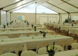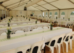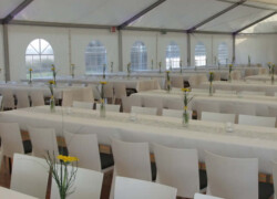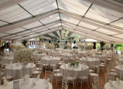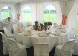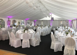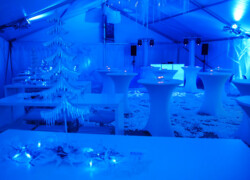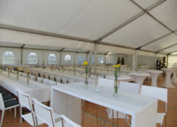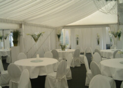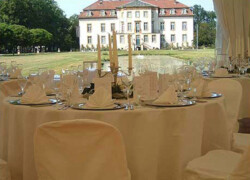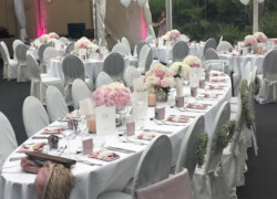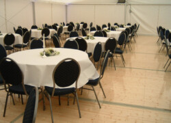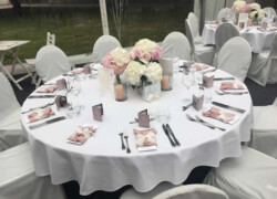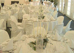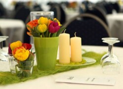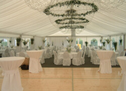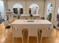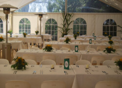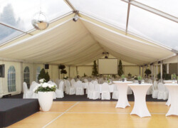 Die verschiedensten Tischdekos, Blumenschmuck, Deckenbeleuchtung und Stoffhimmel verleihen Ihrem Event einen exklusiven Charakter und bieten die passende Atmosphäre.